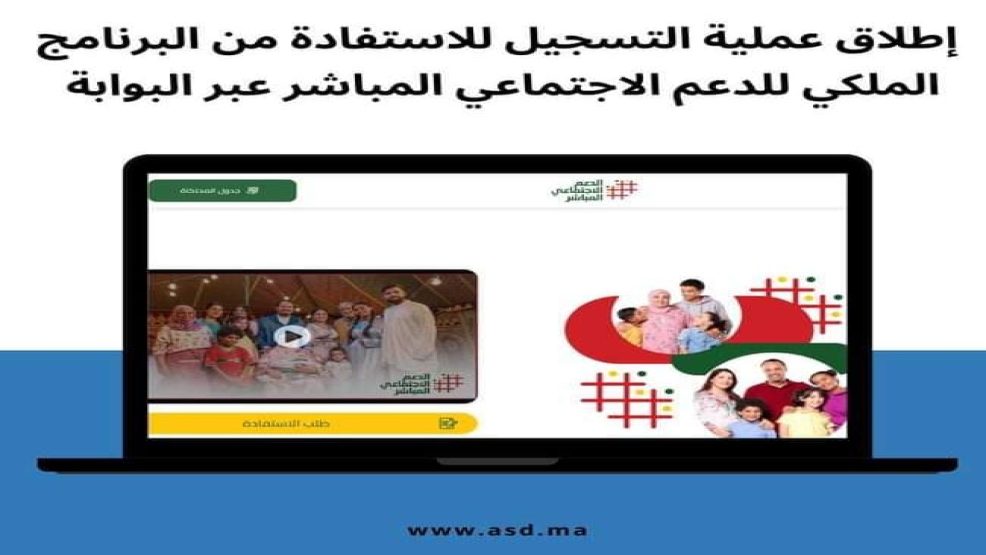 أطلقت الحكومة عملية التسجيل عبر البوابة www.asd.ma للاستفادة من البرنامج الملكي للدعم الاجتماعي المباشر ابتداء من اليوم السبت 2 دجنبر الجاري وذلك بعد التسجيل بالسجل الوطني للسكان والسجل الاجتماعي الموحد.